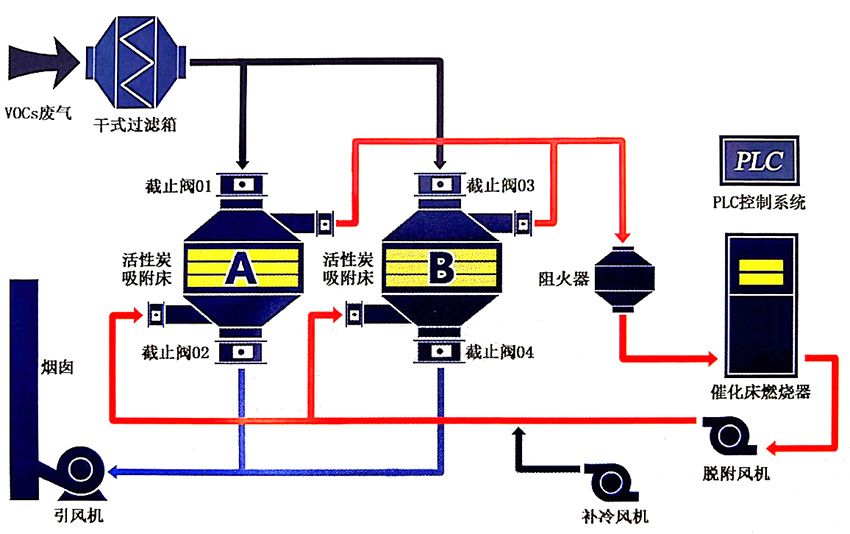 活性炭吸附脫附•催化燃燒裝置是根據吸附(效率高)和催化燃燒(節能)兩個基本原理設計,采用雙氣路連續工作,一個催化燃燒室,兩個或多個吸附床交替使用。先將有機廢氣用活性炭吸附,當快達到飽和時停止吸附,然后用熱氣流將有機物從活性炭上脫附下來使活性炭再生;脫附下來的有機物已被濃縮(濃度較原來提高十倍以上)并送往催化燃燒室催化燃燒成二氧化碳及水蒸氣排出。當有機廢氣的濃度達到2000PPm以上時,有機廢氣在催化床可維持自燃,不用外加熱。燃燒后的尾氣一部分排入大氣,大部分被送往吸附床,用于活性炭再生。這樣可滿足燃燒和吸附所需的熱能,達到節能的目的。再生后的活性炭可進入下次吸附;在脫附時,凈化操作可用另一個吸附床進行,既適合于連續操作,也適合于間斷操作。