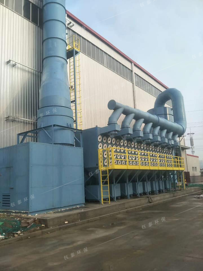 濾筒除塵器的主要構造是由除塵室、脈沖反吹清灰系統(tǒng)和集塵室組成。當含塵空氣進入除塵室后,被圓筒形的濾筒材質阻隔,亞微米以上的粉塵被阻留在濾筒外表面上,過濾凈化后的氣流就從濾筒
