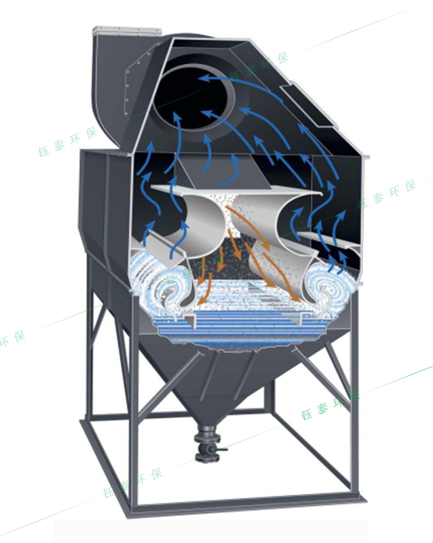 該除塵器分上、下箱體兩大部分,上箱體包括:進出風管、分配送風通道、兩道擋水板、沖洗裝置等。下箱體包括:泥漿斗、加熱裝置等。該除塵器另外還有:排漿閥、液位控制儀、電磁閥和壓差計等。